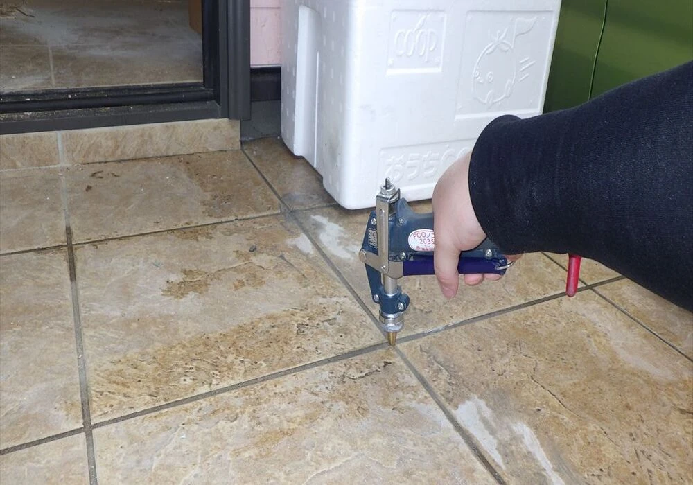 明らかにシロアリからの食害が酷く、薬剤を床下タイルや框部分に対し注入していく形で施工を行っていきます。