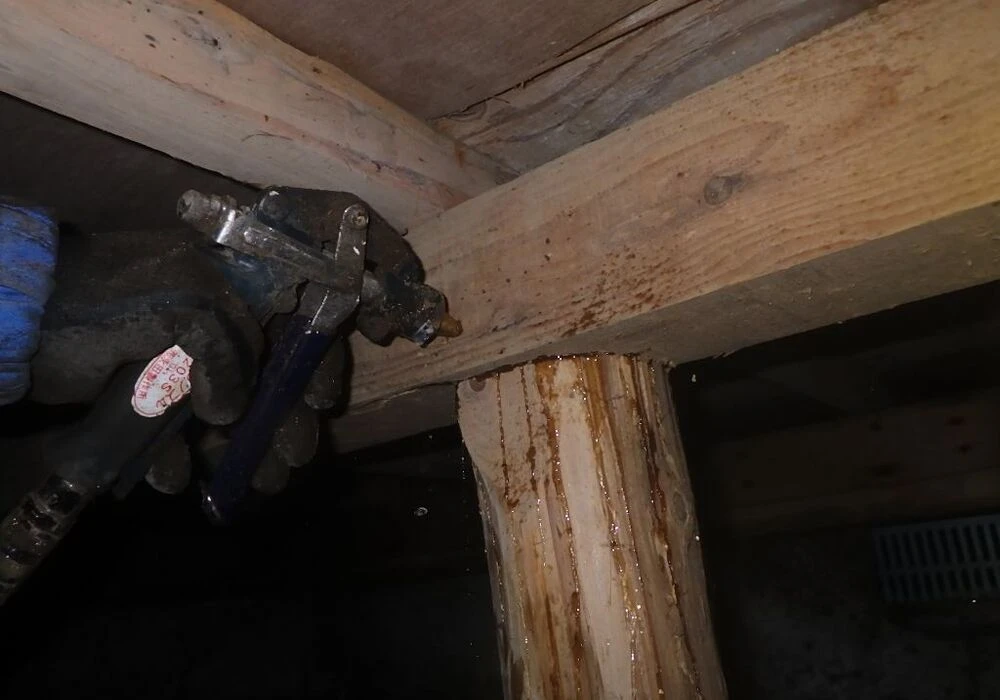今回ご依頼いただいたお客様は、神奈川県大和市にお住まいのN様。シロアリ駆除のご依頼を頂いた段階ではすでに、床下の食害被害が酷い状態が見受けられました。食害がある場所を中心に、木材にい小さな穴をあけて薬剤を中に注入させる形をとることで、木材内に居座るシロアリにもしっかりと駆除施策を行っていきます。